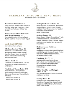 Enjoy a selection of Carolina Breakfast Favorites, All Day Dining, Dinner Features and Desserts from the Carolina In-Room Dining Menu or the Holly Room Service Menu, depending on your stay.