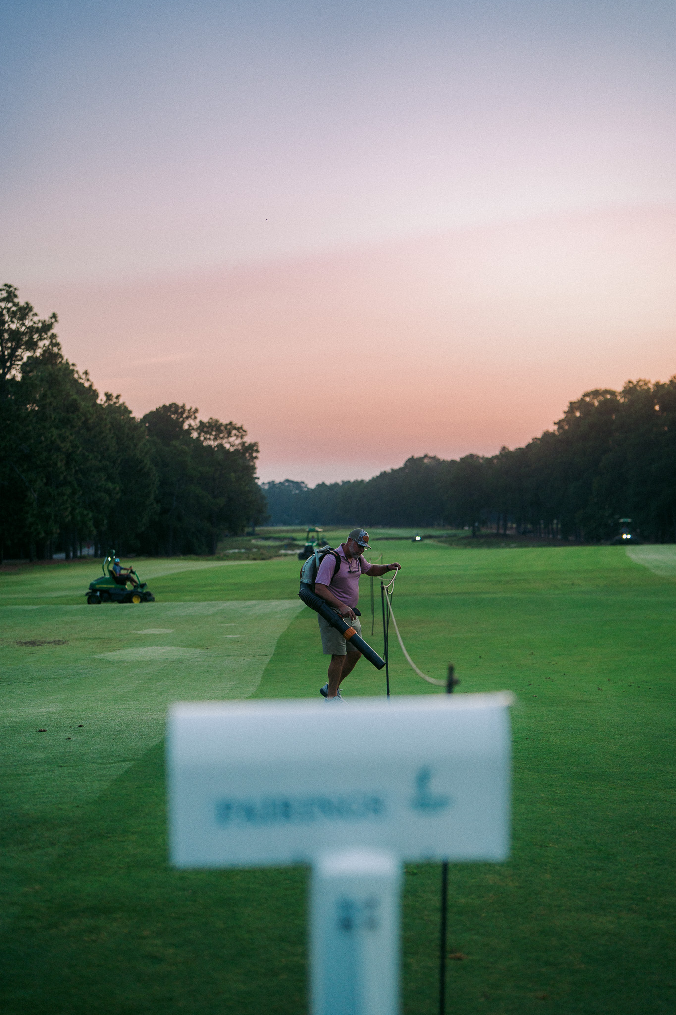 He is thoroughly succinct in his instructions to the players. Even in quiet conversation, his voice cuts through the stew of the heavy air and is delivered with aplomb. Among his instructions are, “Please stay hydrated today.” “Pace of play is critical.” “Please exchange scorecards and identify your golf balls.”